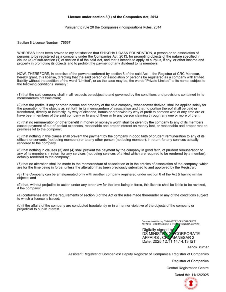 Our Certifications Registration Certificate Section 8 License 12A CSR Registration NITI Ayog ISO Registration